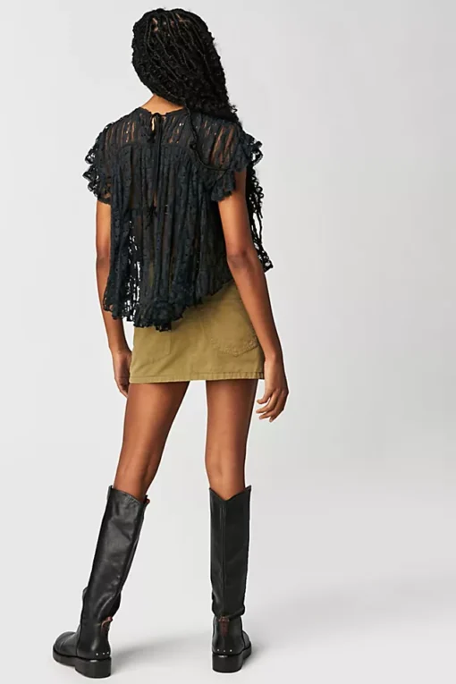 Designed to be dressed up or down. this drapey top is featured in a sheer mesh lace fabrication with flutter sleeves. tie detail at neckline. and defined seaming throughout for added dimension.